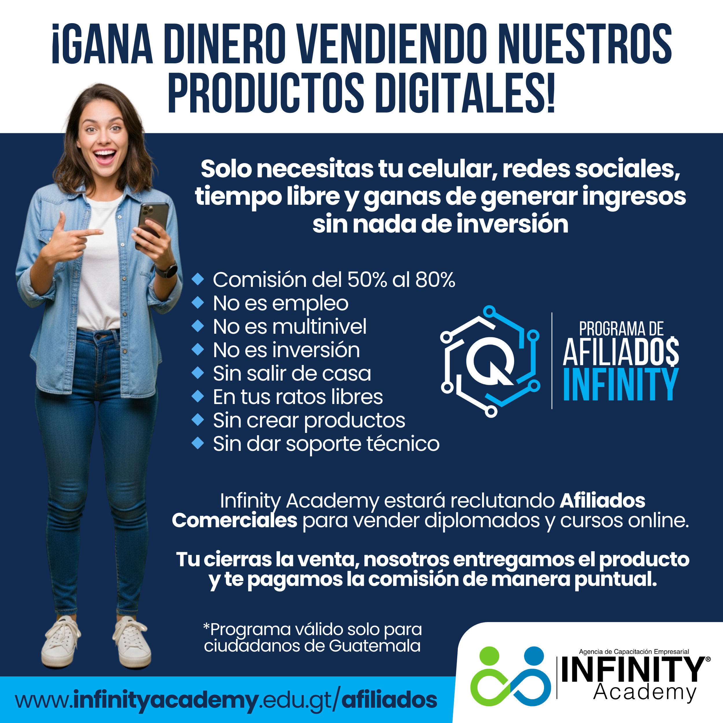 Conviértete en Afiliado Comercial de Infinity Academy y gana entre 50% y 80% de comisión por cada venta validada.